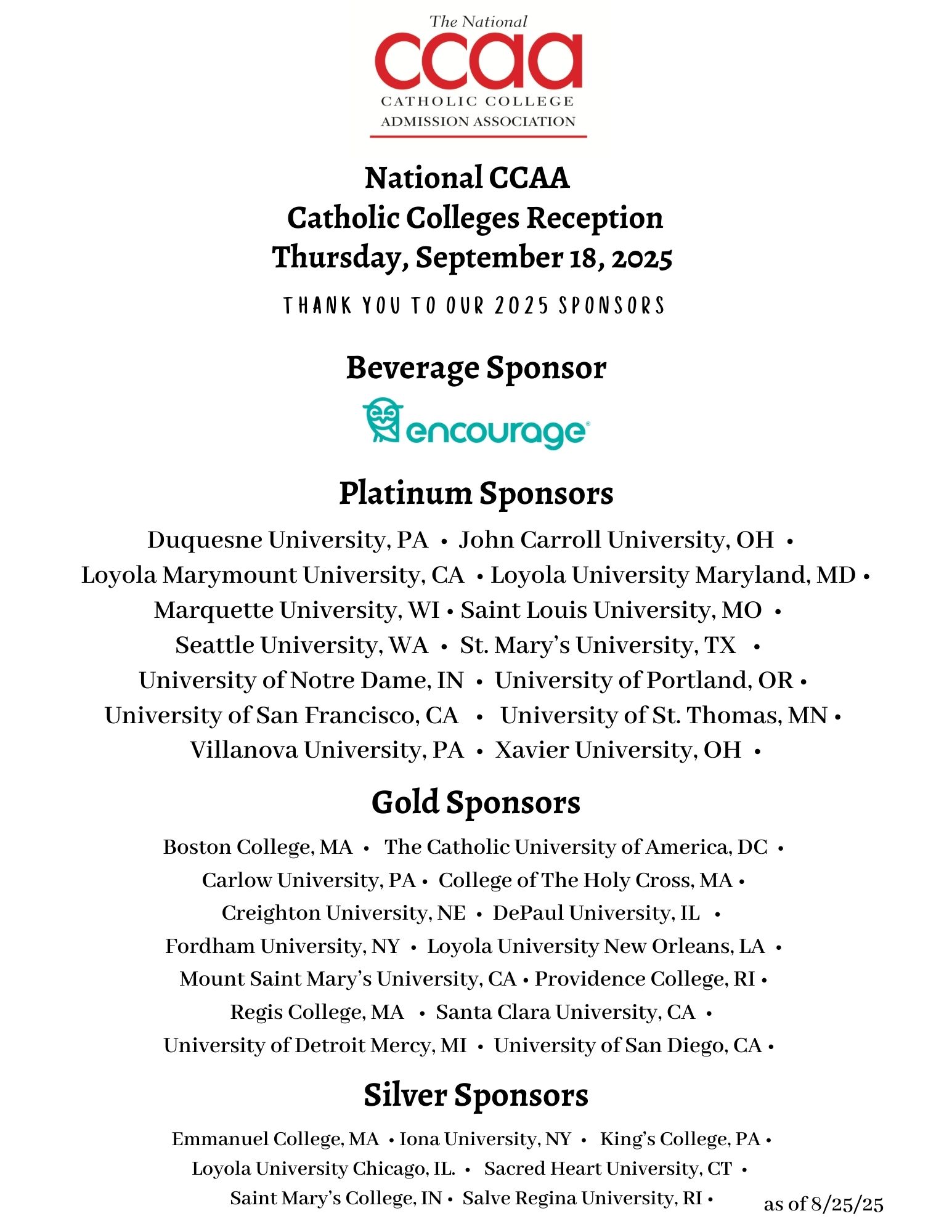 The National CCAA hosts the Catholic Colleges Reception, a memorable event alongside the annual NACAC conference. The casual event brings together a thousand secondary school and independent counselors and admission representatives from National CCAA member institutions for networking and conversation. Each year boasts remarkable entertainment, food and drinks, and an unforgettable evening. Our reception has traditionally been a wonderful way to connect with admission representatives from National CCAA member institutions, as well as other secondary, independent, transfer/community college, and community-based counselors. Registration for the event is required and no one will be allowed to enter the reception without a ticket. Space is limited. Special thanks to all of our National CCAA member institutions who are sponsoring the event this year (see list below) and Encourage, our beverage sponsor. Encourage is a free college and career planning program that encompasses a suite of tools, college and career exploration, and resources designed to provide a deeper level of guidance and engagement between learners and educators. Through its voluntary program millions of students benefit from the connections to colleges and planning resources annually.Please read the following important notes before you register: ✔️ This year's reception will be held on Thursday, September 18, from 7-10 p.m. at the Ohio Statehouse in downtown Columbus. Typically our reception is held on the Friday evening of the NACAC Conference. Please note the change for this year. ✔️ We would like to accommodate as many of our special guests (high school counselors, independent counselors, CBO counselors, and transfer counselors from two-year/community colleges) and admission reps from our member schools as possible. Due to overwhelming interest and limited space, bringing a guest (spouse or partner) is not permitted. Registration is also NOT transferrable. ✔️ Each counselor or admission representative from National CCAA member institutions must register separately and individually, so pass the link to register to your colleagues if several staff members from your office will be attending. ✔️ This reception is ONLY for high school counselors, independent counselors, CBO counselors and transfer counselors from two-year/community colleges, and admission staff at National CCAA member institutions (no one under 21 is allowed). As soon as we reach our capacity number, we will close down registration, so complete your registration ASAP!